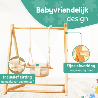 Het natuurlijke houtdesign past in elke kamer en gaat jarenlang mee. Met het meegeleverde zachte kussentje zit je baby altijd lekker en het frame blijft stevig, dag in dag uit. Of je nu binnen of buiten speelt, deze schommelstoel is altijd een blikvanger.